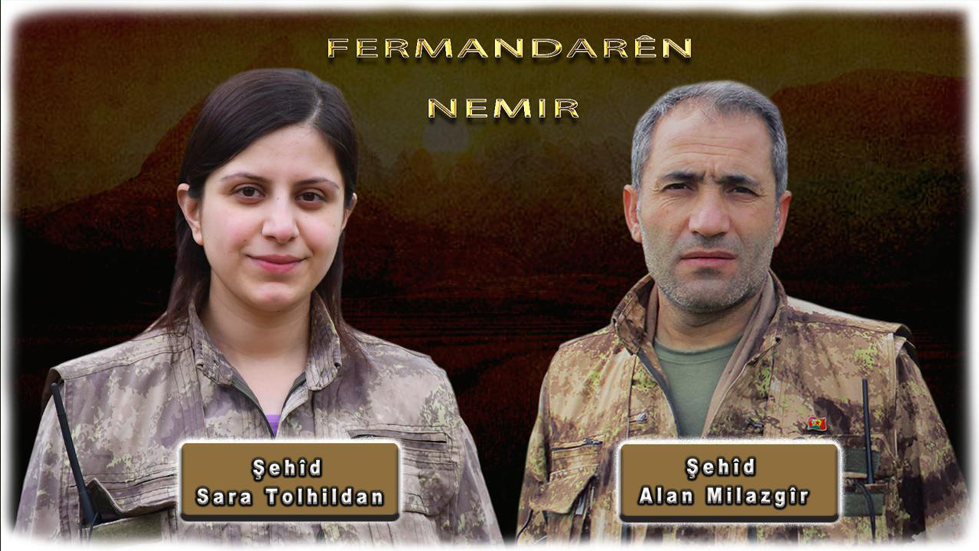 Endamê Fermandariya Sewq û Îdareyê ya Herêmên Parastinê yên Medyayê û Konseya Fermandariyê ya HPG'ê hevrêyê me Alan Milazgîr û hevrêya me Doktor Sara Tolhildan 21'ê Hezîrana 2024'an li Qada Berxwedanê ya Sîda ya Zapê di çalakiya êrişa fedaî ya li dijî artêşa Tirk a dagirker de şehîd bûn.