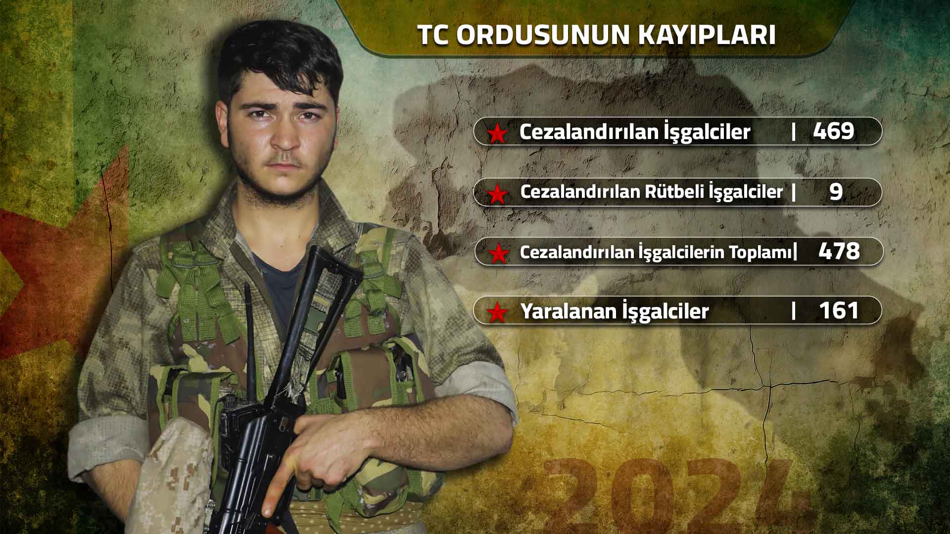 İşgalci Türk ordusu, yıl başında yeni tarz ve taktikler uygulayacağını iddia edip çokça propagandasını yapmıştır. Ancak sahadaki mevcut pratik bunun tam tersini kanıtlamış, işgalci ordu risk alarak sahaya bazı hareketli birlikler sürmekten ve eskiyi tekrarlamaktan başka hiçbir şey yapamamıştır. 2024 yılı boyunca geliştirilen işgal saldırılarında Türk ordusu amacına ulaşamamış, sonuçsuz bırakılmış, taktik tıkanıklığını aşamamış ve başarısız olmuştur. 2024 yılı mücadelesinde, Medya Savunma Alanları’na dönük işgal operasyonlarının komuta merkezindeki 1 yarbay, 2 binbaşı ve 1 yüzbaşı olmak üzere çeşitli rütbelerde 9’u komutan toplam 478 işgalci cezalandırılarak işgalci orduya ağır darbe vurulmuştur. İşgalci Türk ordusu daha önceki yıllarda olduğu gibi bu yıl içerisinde de işgal operasyonlarını sevk ve idare eden komutanlarını değiştirmiş, çok güvenerek ve överek görevlendirdikleri komutanlarını da başarısızlıklarından ötürü görevden almak zorunda kalmıştır.